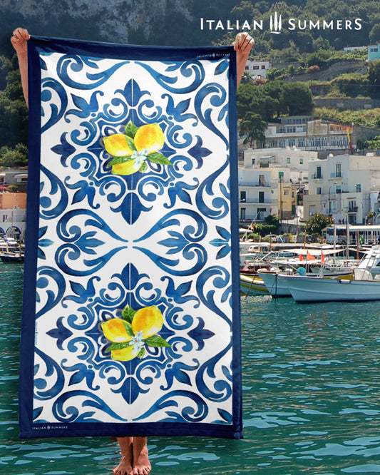 Beach towel Italy blue tiles and lemons, maiolica beach towel, Italian Beach, Amalfi Coast, Positano, Capri, Amalfi Lemons, Sorrento Lemons