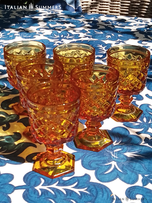 Vintage Bormioli Amber Glass Carafe & 6 Diamond Goblets Set (1970s) – Rare Find