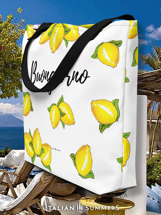 Tote Bag BUONGIORNO LIMONI | Italy tote, beach tote, Italian food lovers, Cucina Italiana, Italian food theme, Amore, Ciao, Italy traveler
