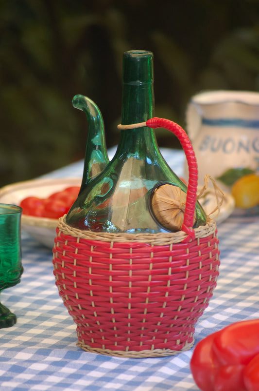 Vintage 1960s Italian emerald-green Empoli glass decanter with ice chamber. Red wicker decorated. Hand-blown in Tuscany.