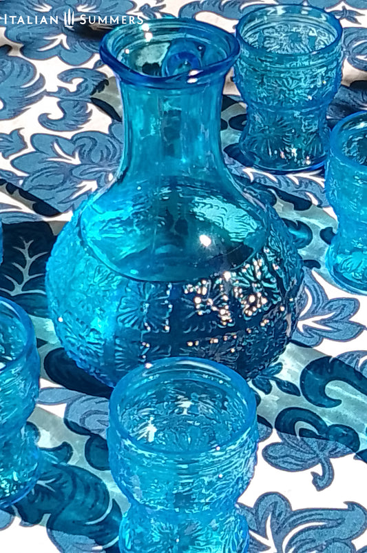 Vintage Bormioli Blue Embossed Glass Carafe & 6 Tumblers Set (1970s) – Rare Find
