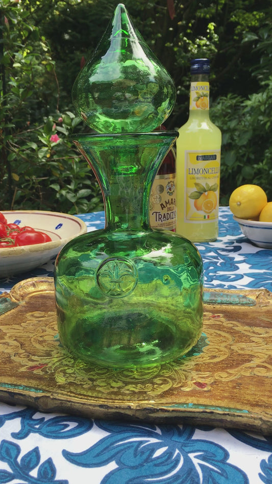 Vintage 1960-70s Empoli emerald glass decanter with Florentine seal, genie bottle.