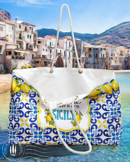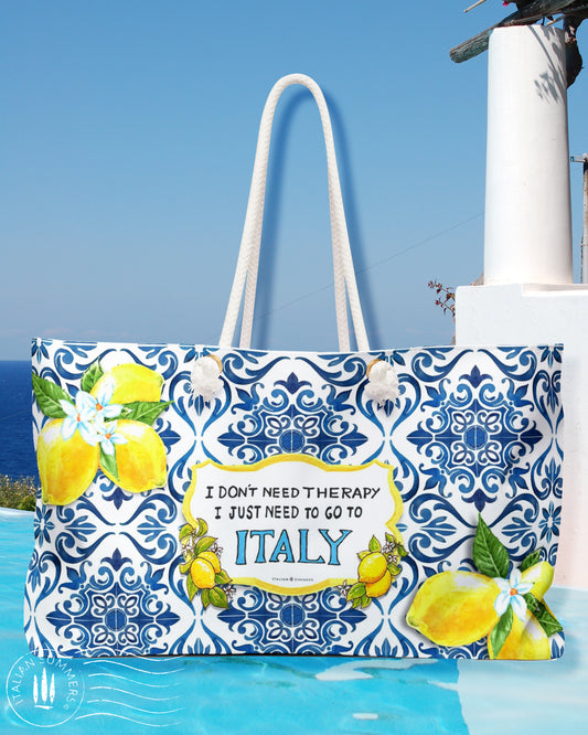 XL beach bag I don't need therapy, I just need to go to Italy blue tiles and lemons by Italian Summers