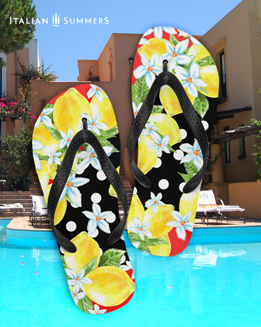 Italy Flip Flops LEMONS and POLKADOTS, (Black) Italy lemons, Amalfi lemons, Capri lemons, Italy travel, Italy beach, Italy lovers, Italy vacay