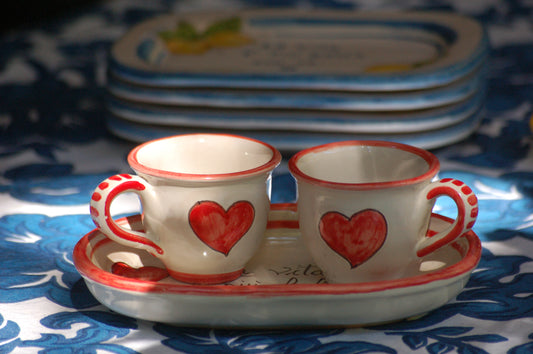 Italian Maiolica espresso coffee set DUE CUORI - La vita e Piu Bella con te. Decorated with Sicilian hearts hand painted in Sicily. Limited edition.