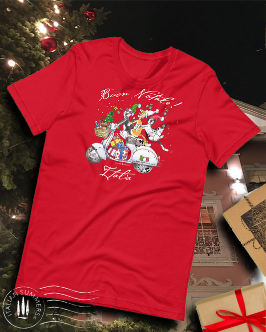 Italy Christmas t-shirt BUON NATALE ITALIA, Italian Singing Cats on a vintage Italian scooter, Italy Xmas gift, Italy quote, Italian Christmas, Italy traveler, vintage Italian scooter, Italian Cats, Italian Xmas gifts