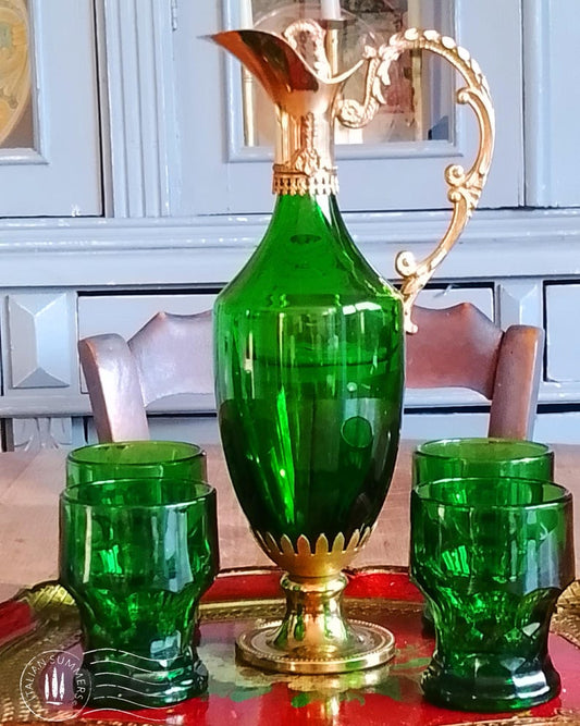 Italian Vintage 1960s-70s RARE emerald-green glass wine carafe and FOUR sculptural emerald-green glass goblets from the 1960s-70s