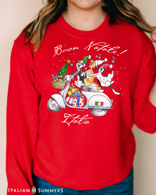 Italy Christmas Sweatshirt BUON NATALE ITALIA Cats on a vintage Italian scooter