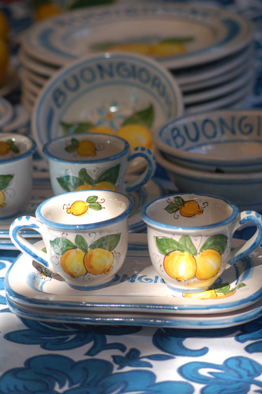 Italian Maiolica Espresso Set - BUONGIORNO text, Limoni, Amalfi Lemons, Handpainted