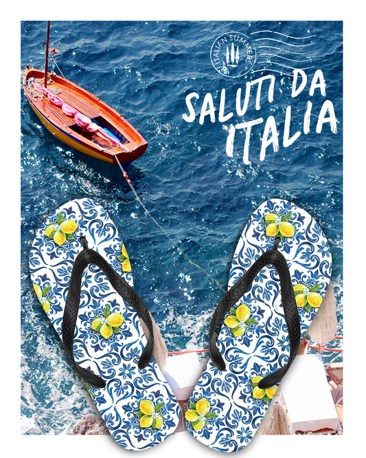 Italy Flip Flops, blue tiles and lemons, Italy lemons, Italy tiles, Italy beach, Italy traveller, Italy vacation, Italy gift, Italy maiolica