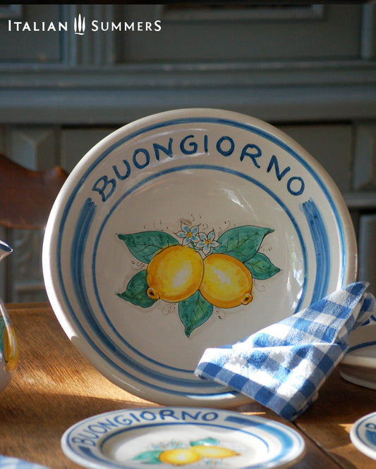 Large Italian Maiolica ceramic Fruit Stand with Amalfi Coast lemons and Buongiorno text, artisanal product, made in Sicily