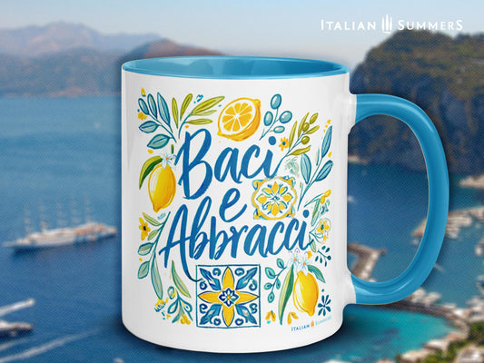 Mug Baci e Abbracci, Italy quote mug, hugs and kisses for your morning latte, say it in Italian!