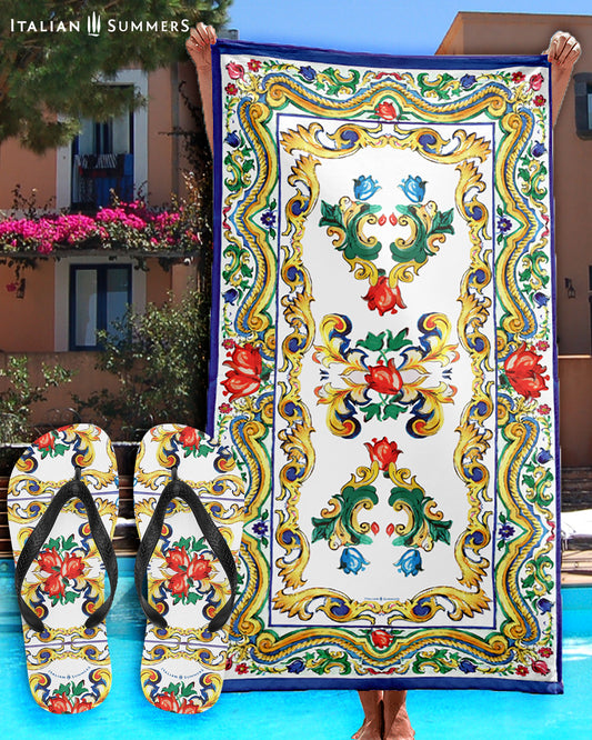 Flip flops Sweet Sicilian Maiolica, Italy beach towel, Italian tiles, Italian baroque, Italy Beach, Sicily, Amalfi Coast, Positano, Capri,