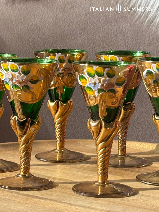 Set of 6 Vintage gold-rimmed emerald glass liquor goblets Murano-style flower décor