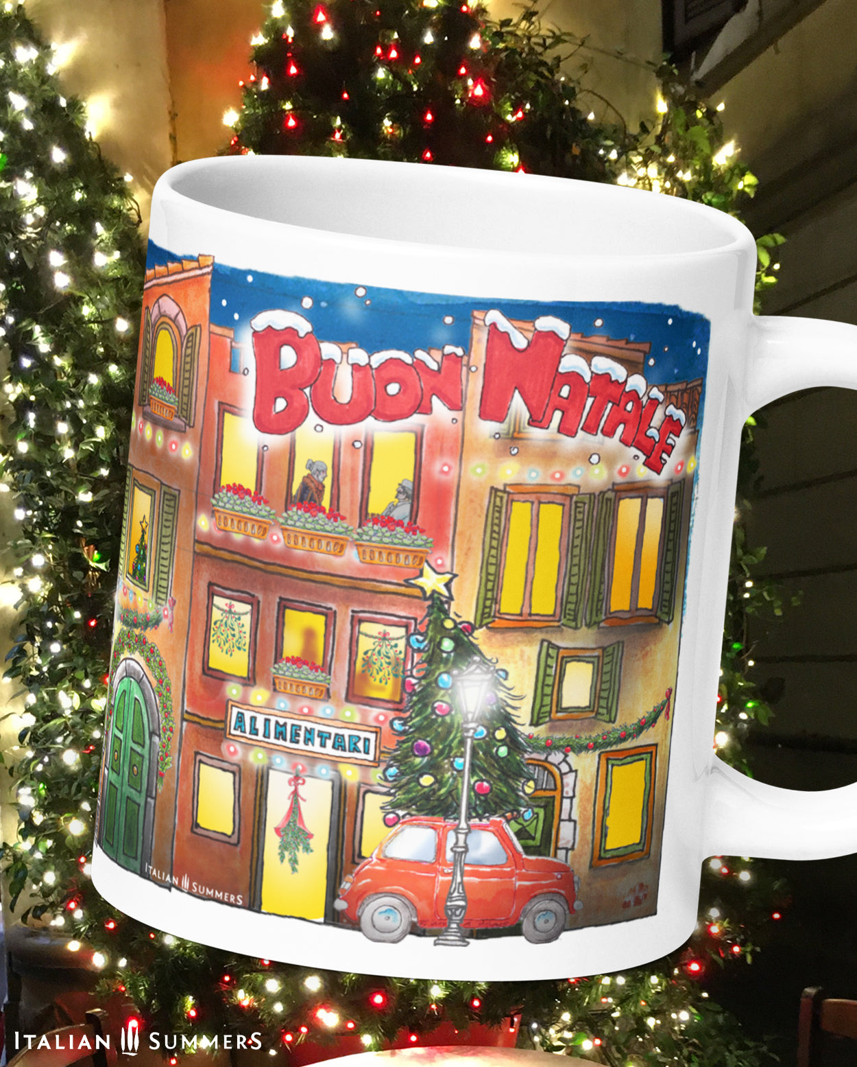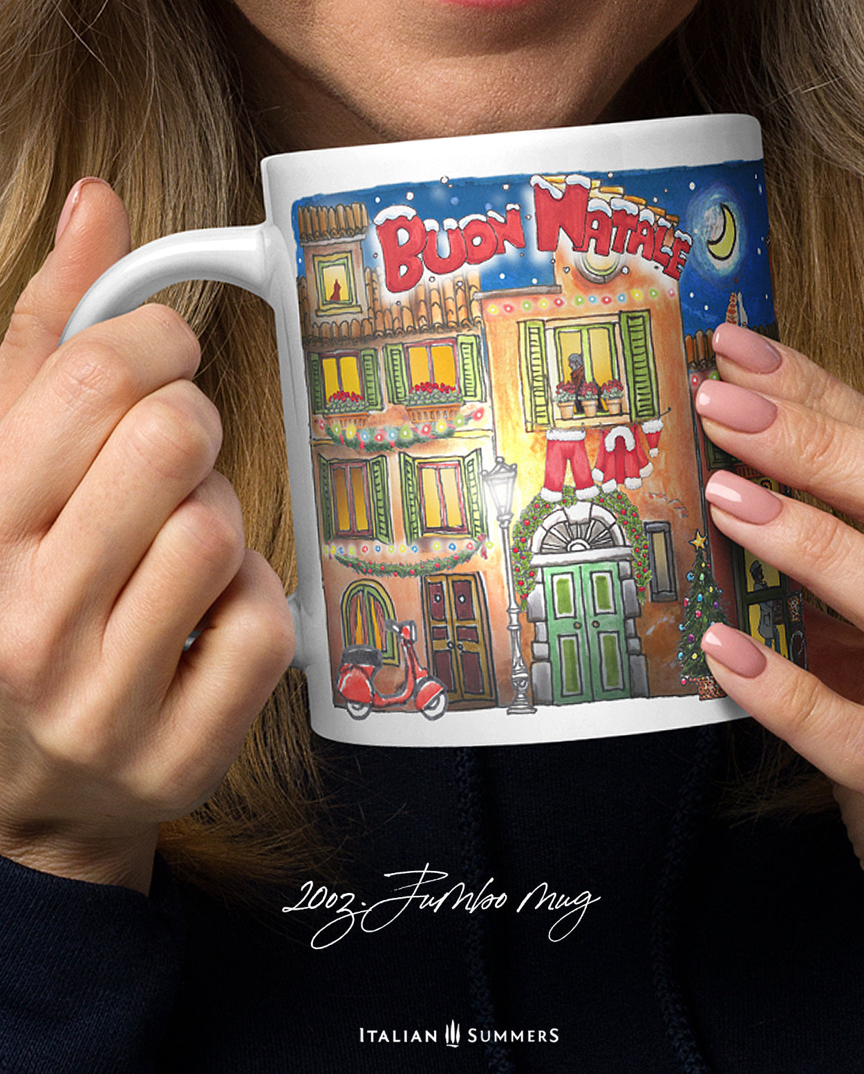 Step into a festive wonderland with our Villaggio di Natale mug! Featuring an adorable Italian village street scene decked with classic buildings, festive green shutters, and colorful flowerpots, this cup brings the joyous spirit of Christmas to life. Hear the cheerful buzz of a little Vintage Italian car as it drives along, a Christmas tree atop its roof, while twinkling garlands and strings of light drape over the old architecture.