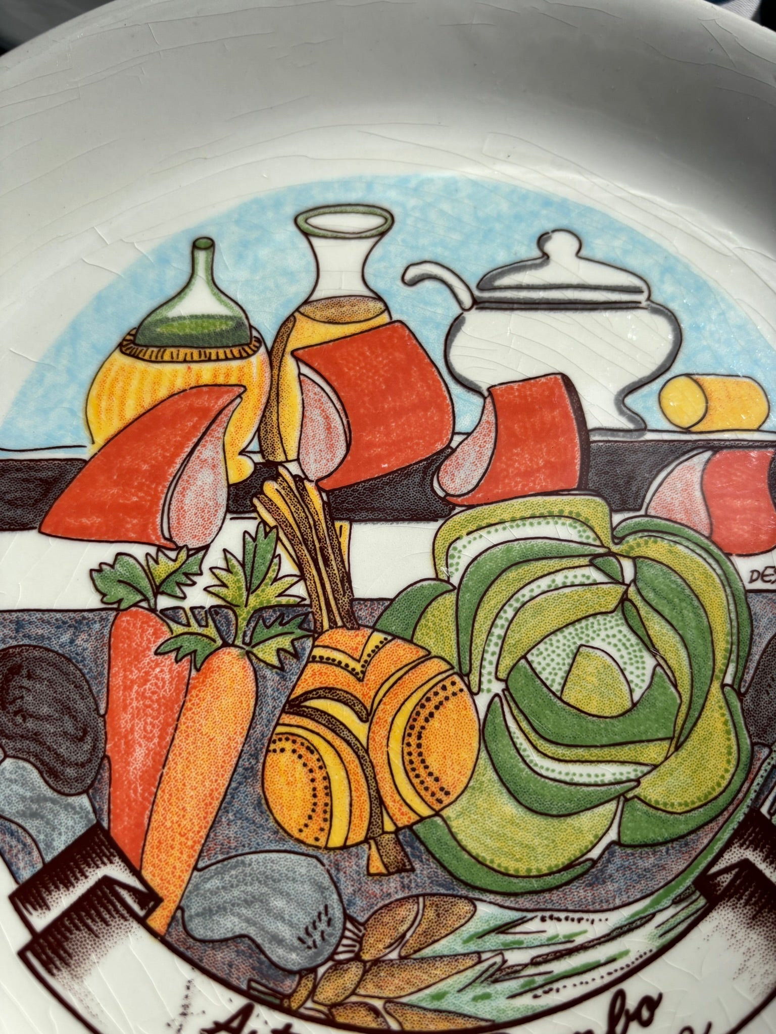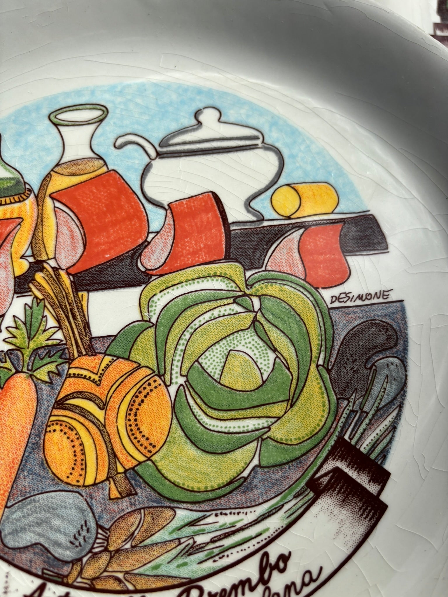 During the 1960s–70s, Autogrill collaborated with the Sicilian artist Giovanni De Simone to create a series of hand-painted ceramic souvenir plates sold in their famous Italian highway travel stops. These were never restaurant plates — they were sold as collectible keepsakes celebrating Italian food, travel culture, and regional recipes. Today, they are cherished pieces of mid-century Italian folk art.