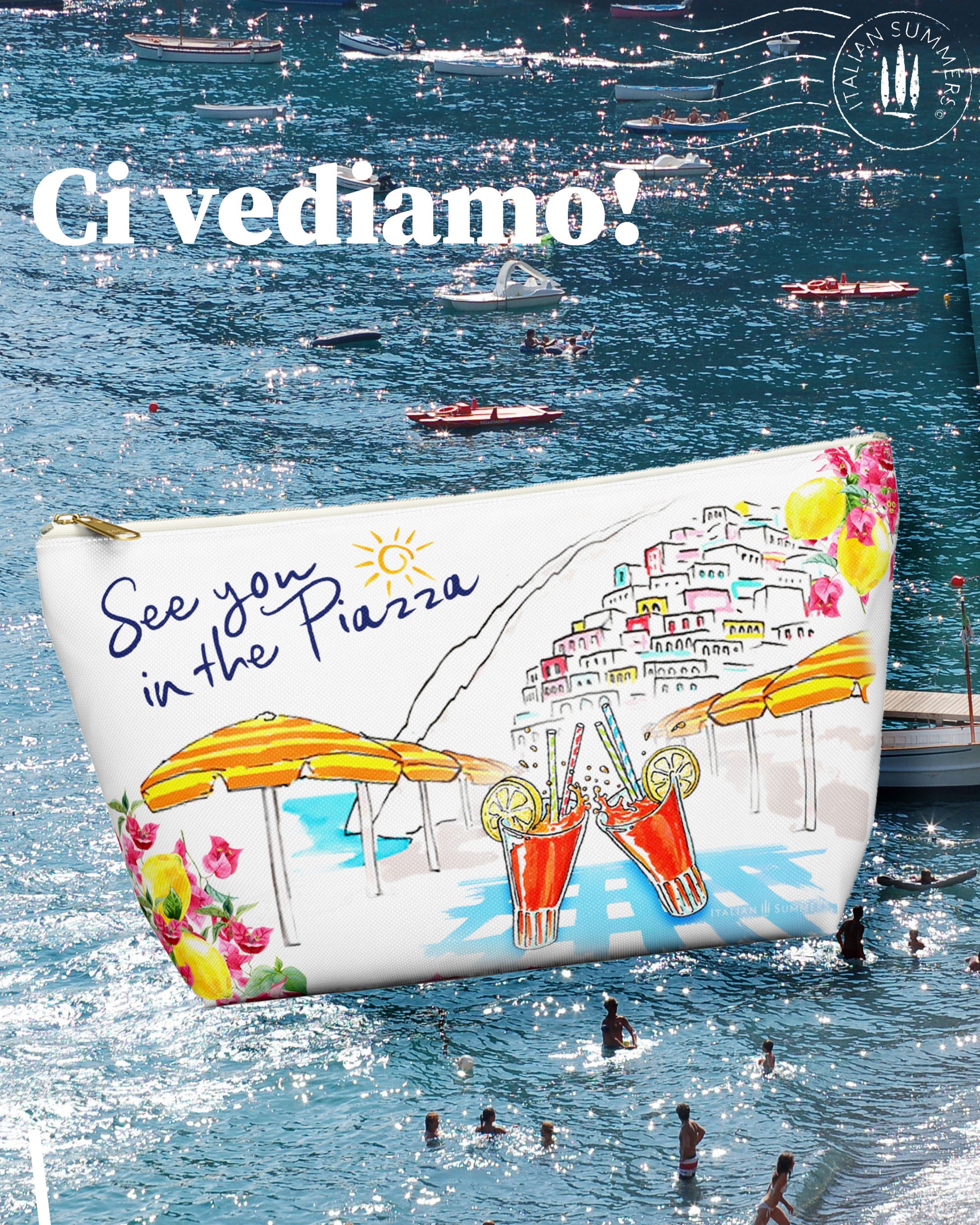 Have a little taste of the essence of Italy with our happy colored clutch, adorned with enchanting sketches of Italian coastal villages, little Vintage Italian cars, tasty gelatos, refreshing Aperol Spritz, and the inviting ambiance of beachside pranzo tables. Inspired by the vibrant hues of happy lemons and the cascading beauty of bougainvillea, this clutch is a celebration of all things Italian.