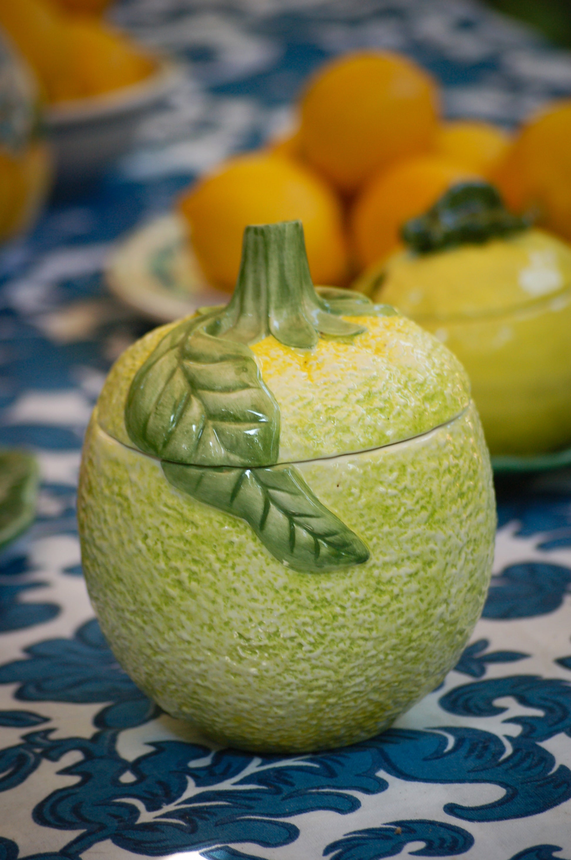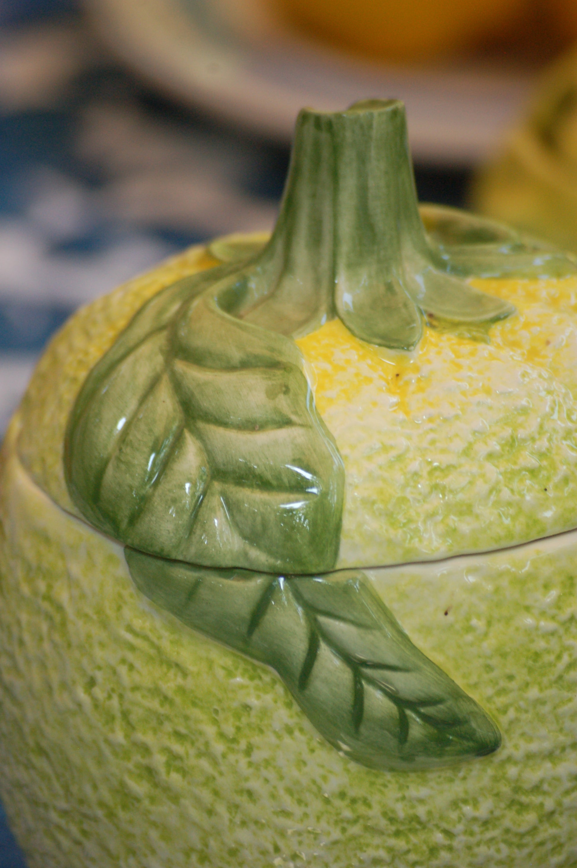 Add a touch of playful charm to your table with this delightful set of 3 vintage French ceramic serving bowls. Featuring two bowls shaped like lemons and one shaped like a bell pepper, each comes with a matching cover for a whimsical presentation.