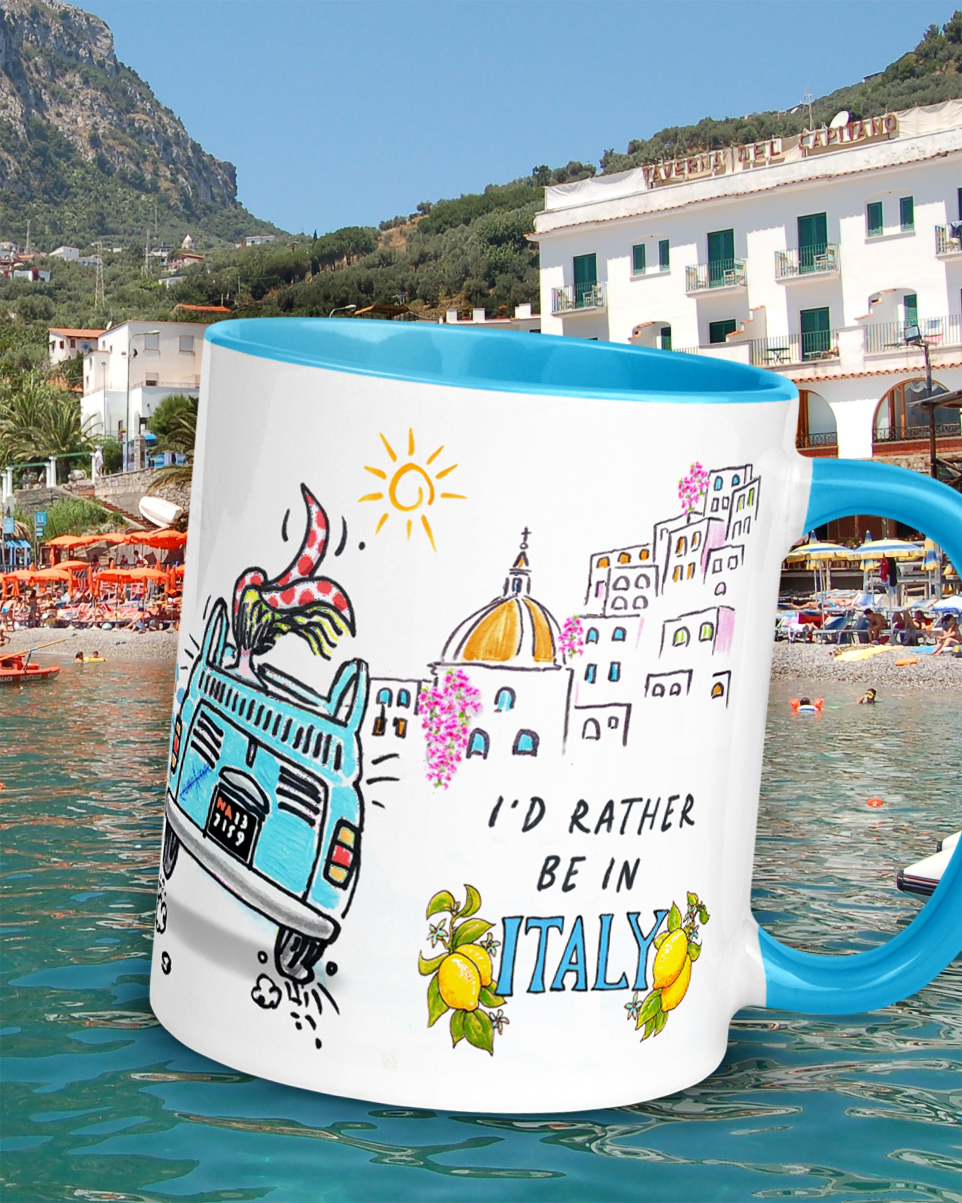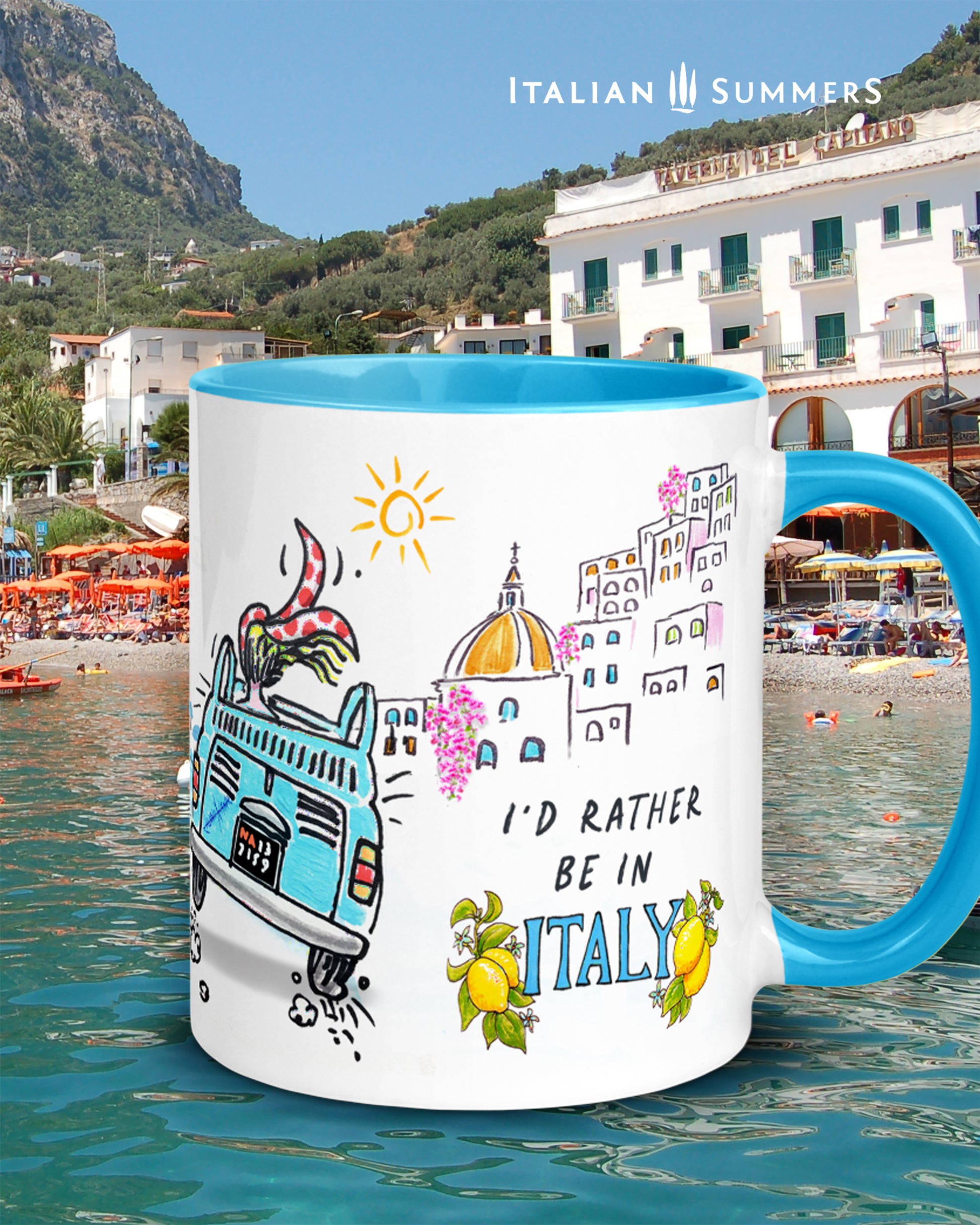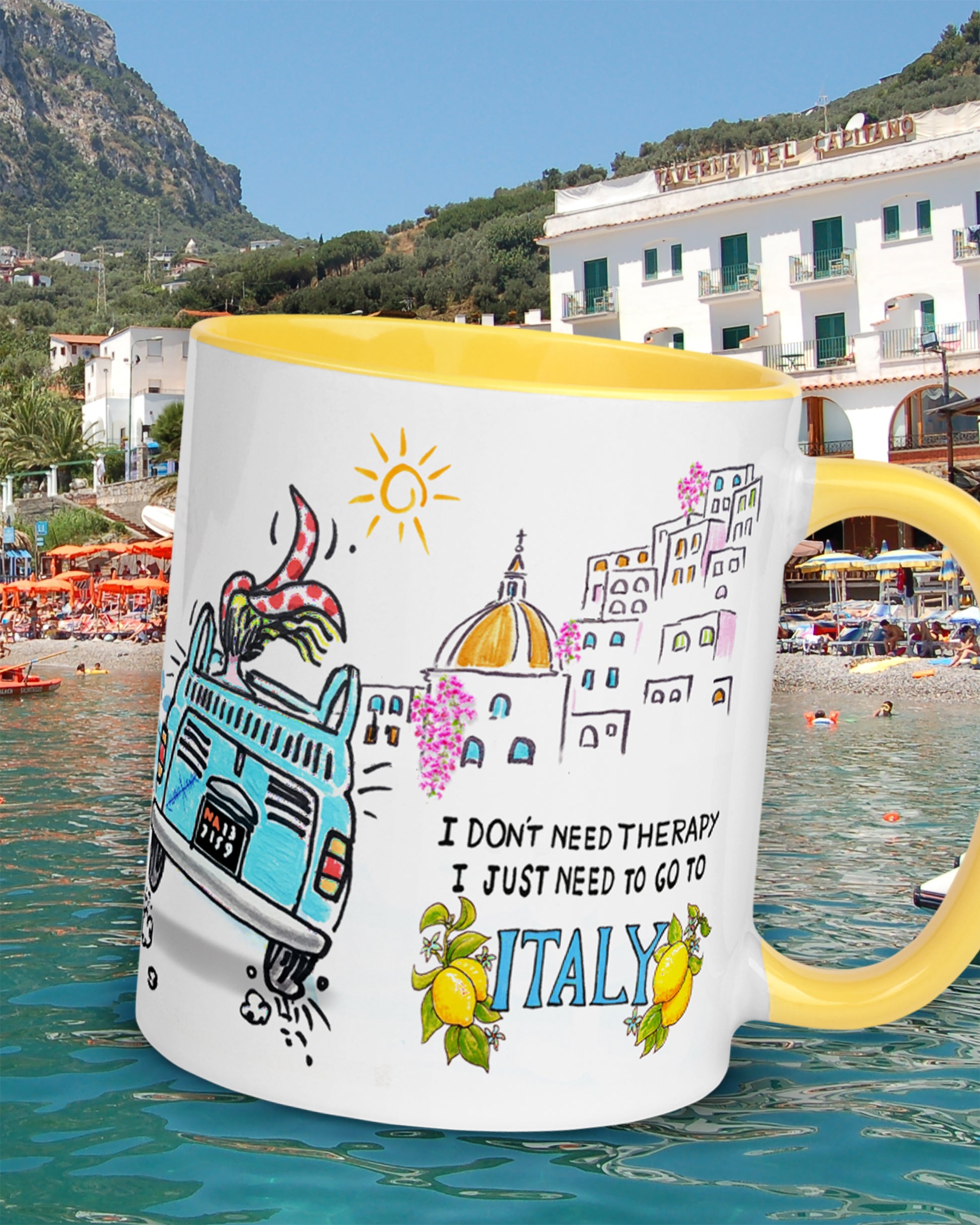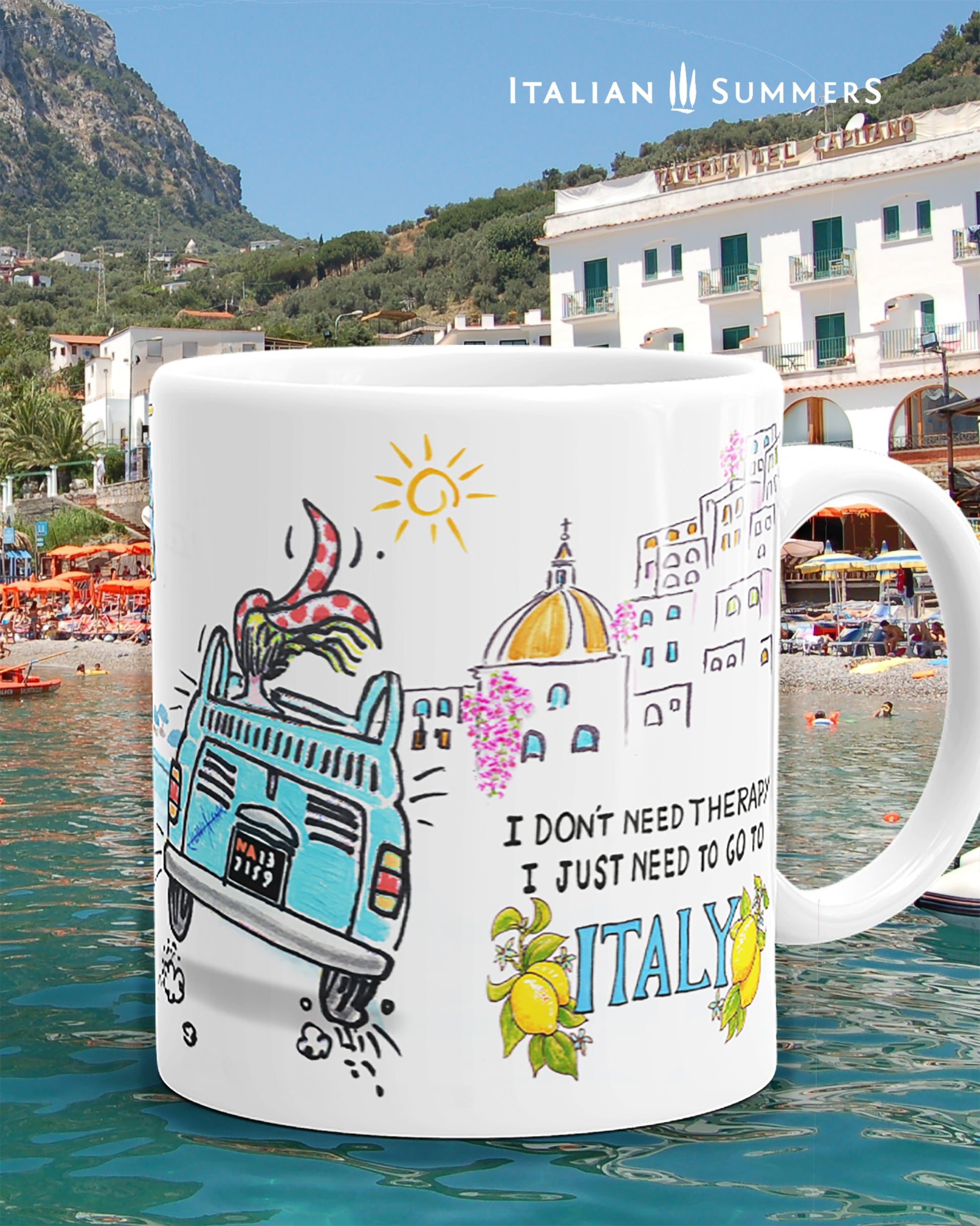 Enjoy some Italian summer therapy with this unique mug featuring a sketch of an idyllic Italian beach scene with a little Vintage Italian car, beach chair and umbrella, and the quote "I don't need therapy, I just need to go to Italy"! Unwind in style and bring a little Italian sunshine into your life.