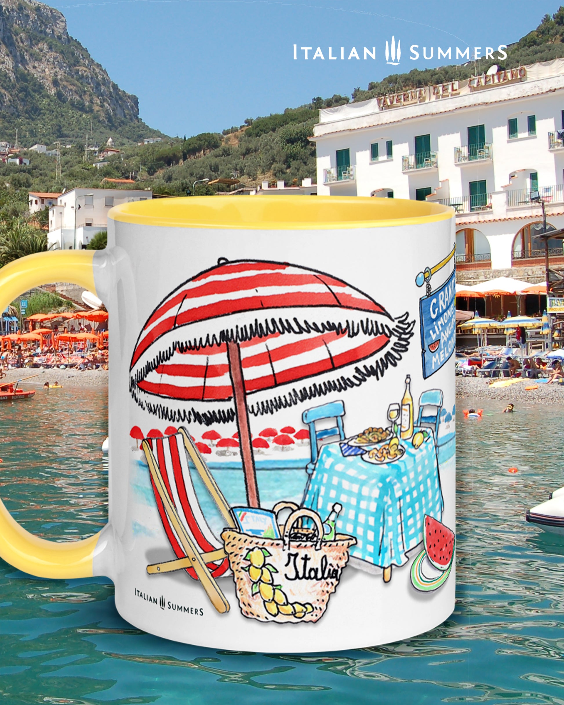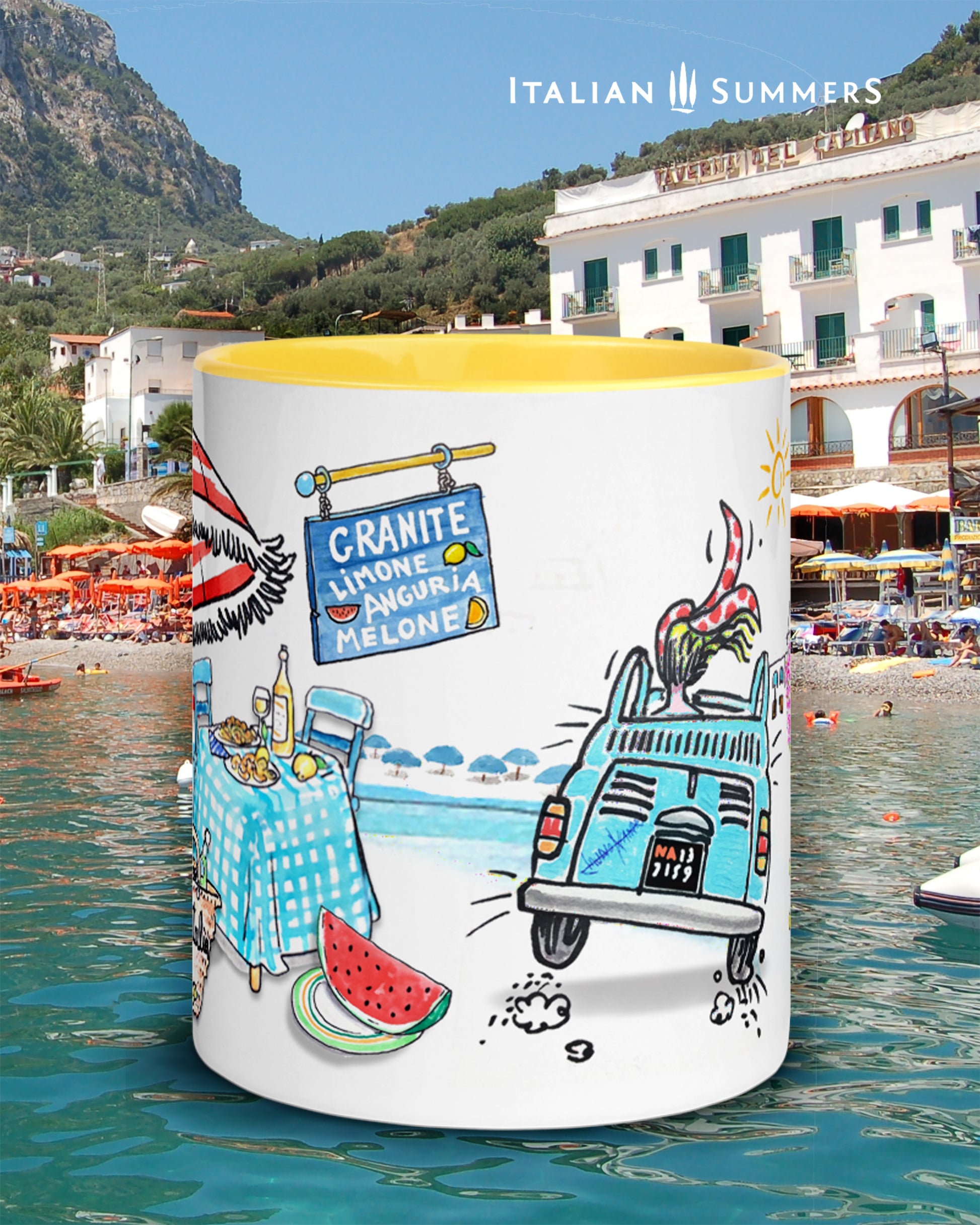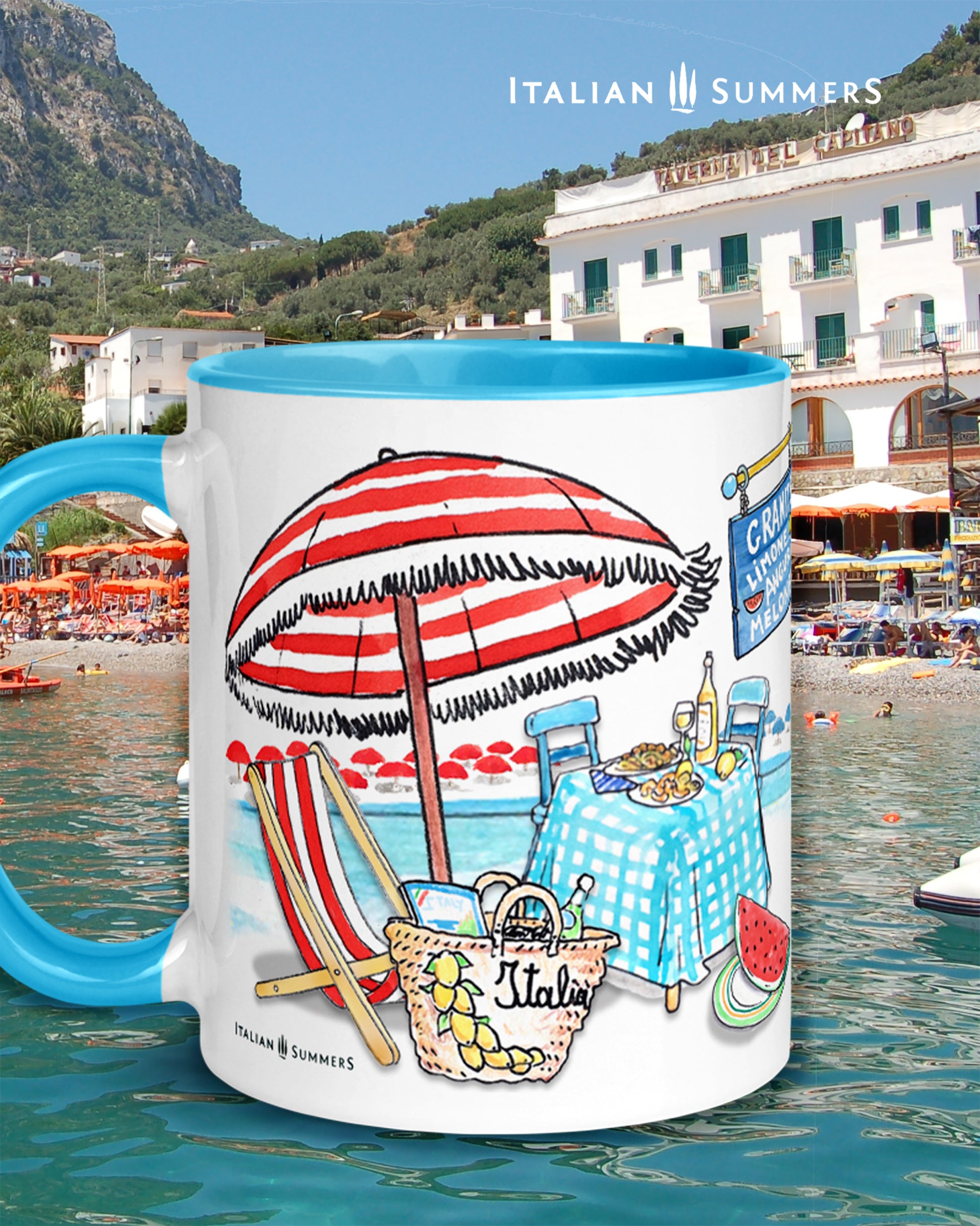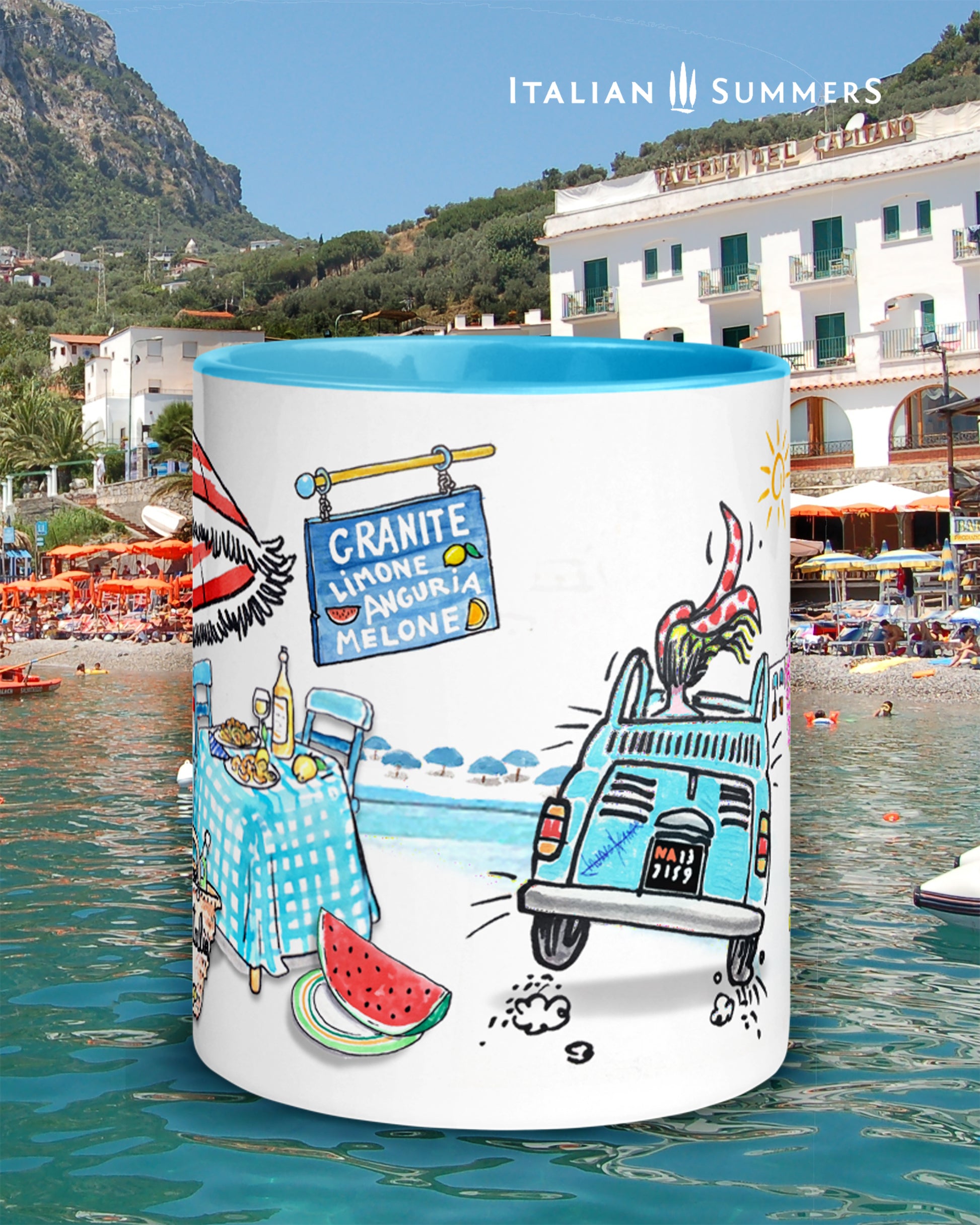 "An Italian Summer" With the little space that there is on this mug we tried to capture a few of the tipical Italian Summer scenes as we witness them in the little fishermen villages on the coast of Italy, on the islands and on the lakes. We could fill a book with summers scenes and summer memories. It is true right?! We all have our Italian Summers memories.