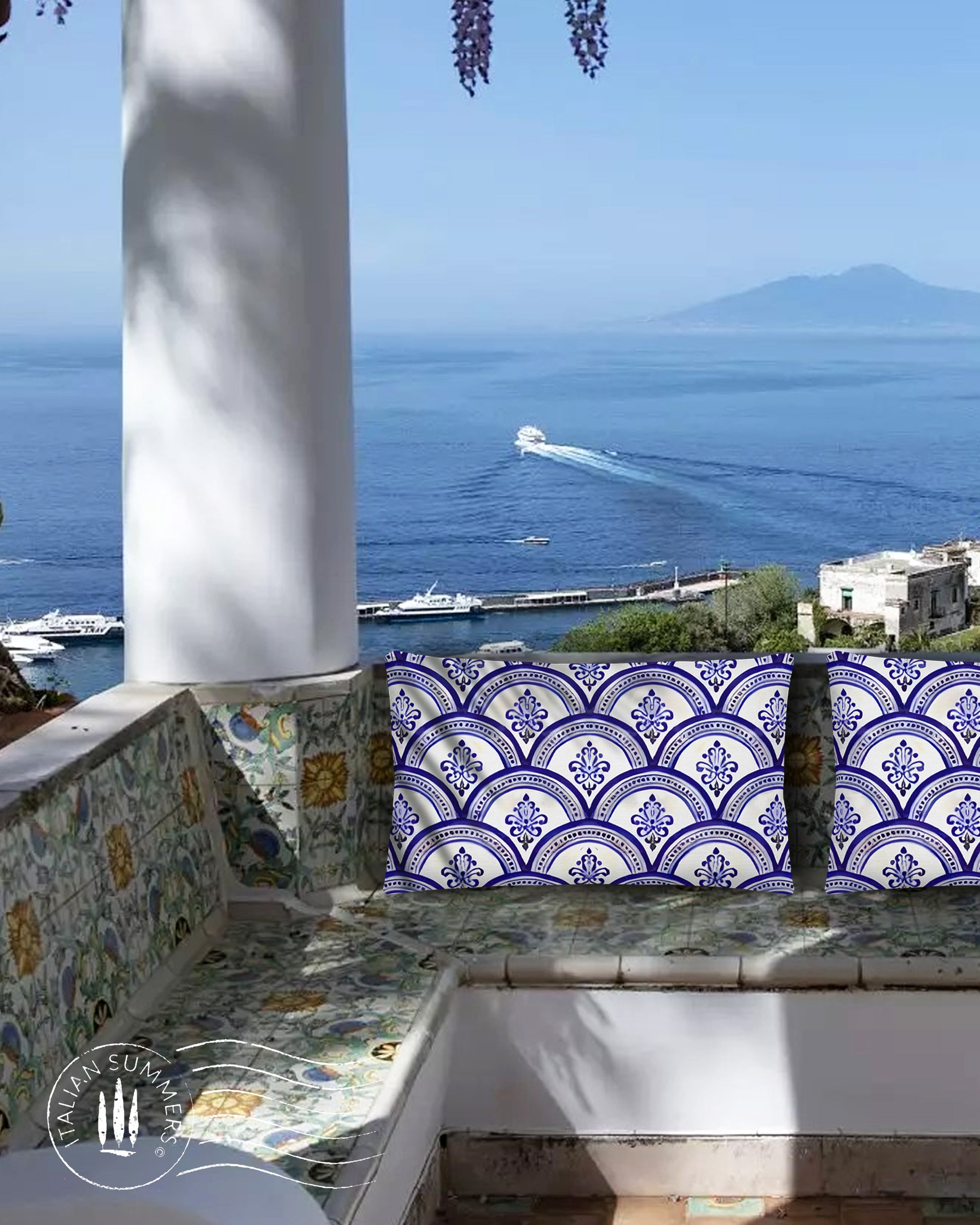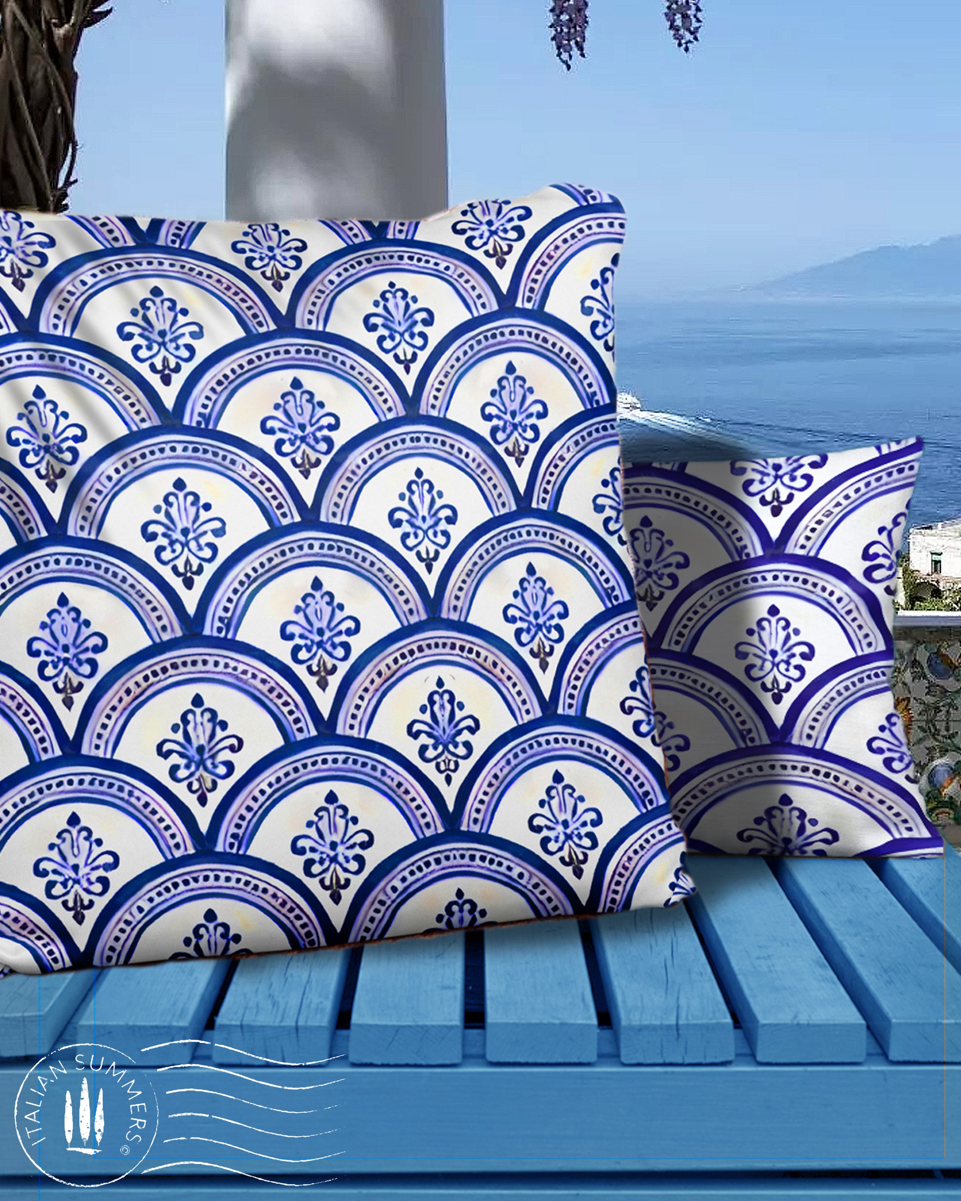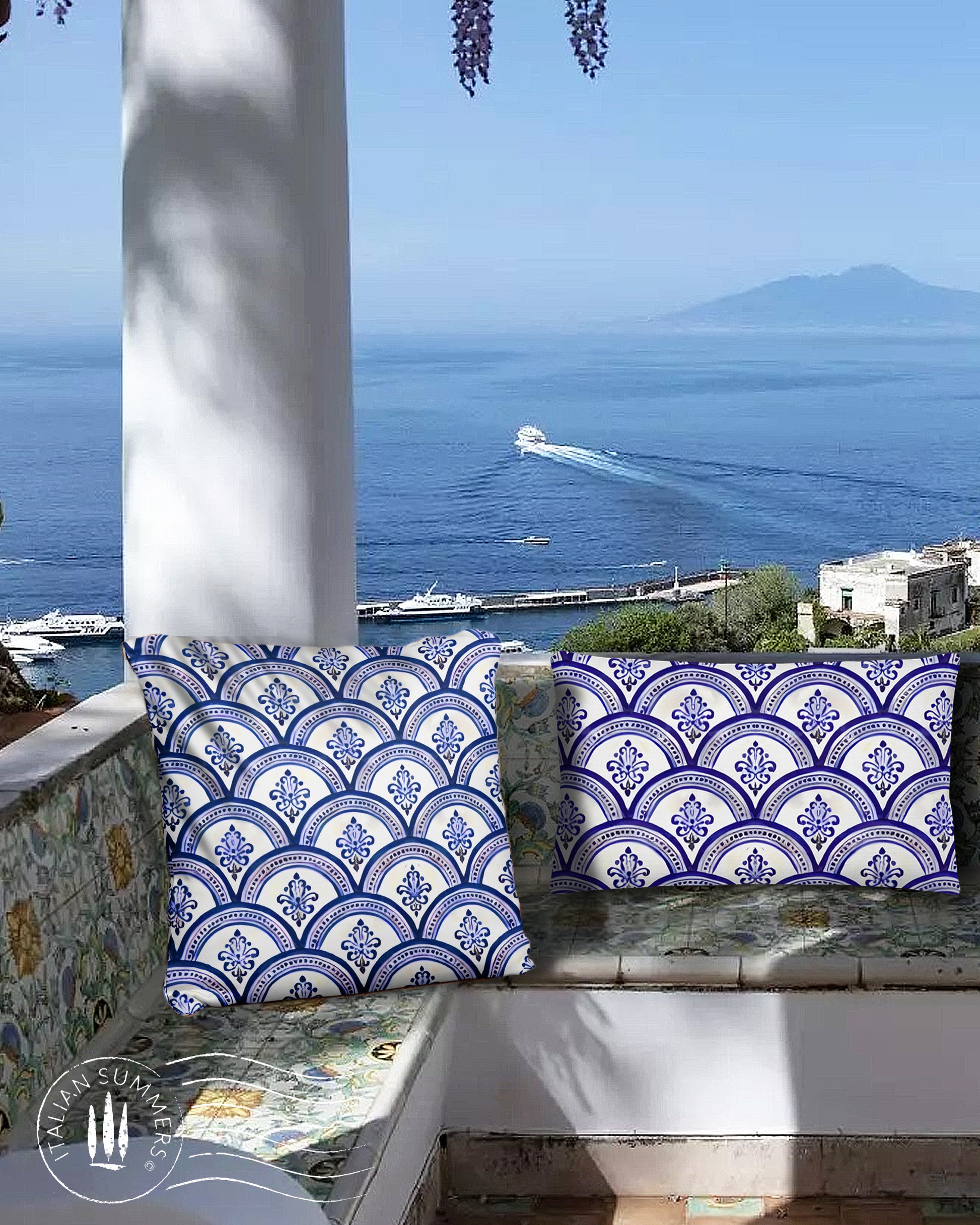 Elegant Amalfi Coast inspired pillow cases that feature an azure Mediterranean 'scallop' pattern, reminiscent of the maiolica-tiled domes of the seaside villages of Campania, Italy.