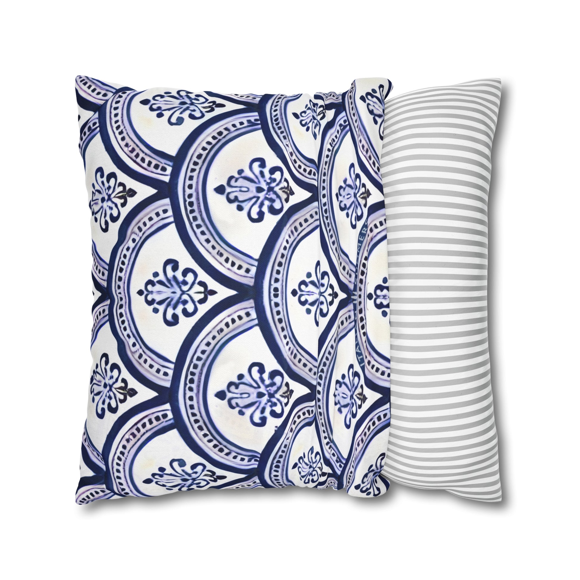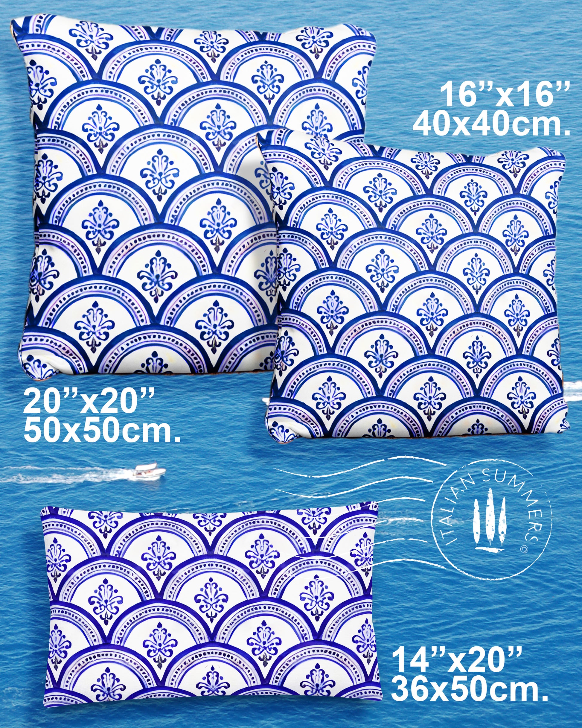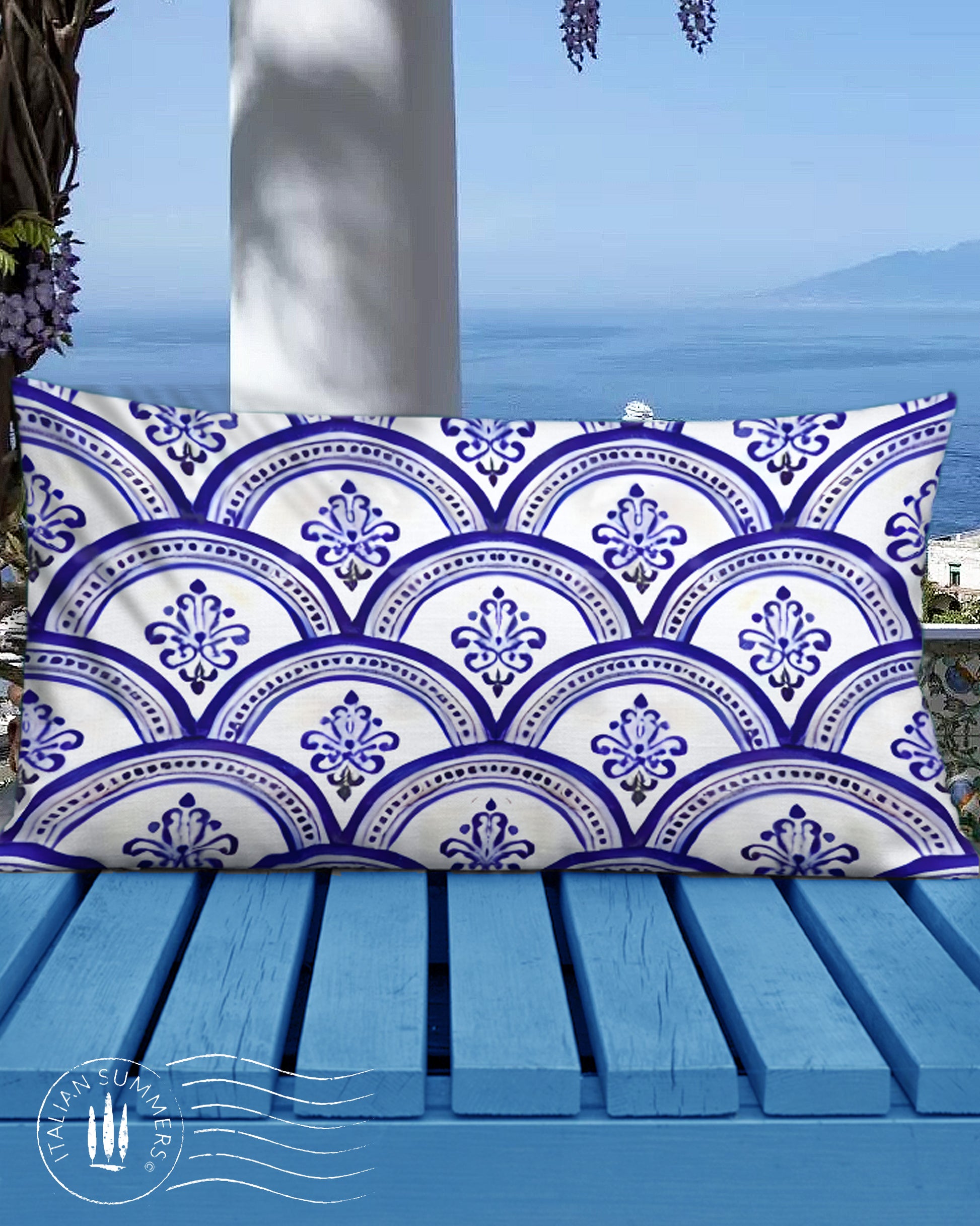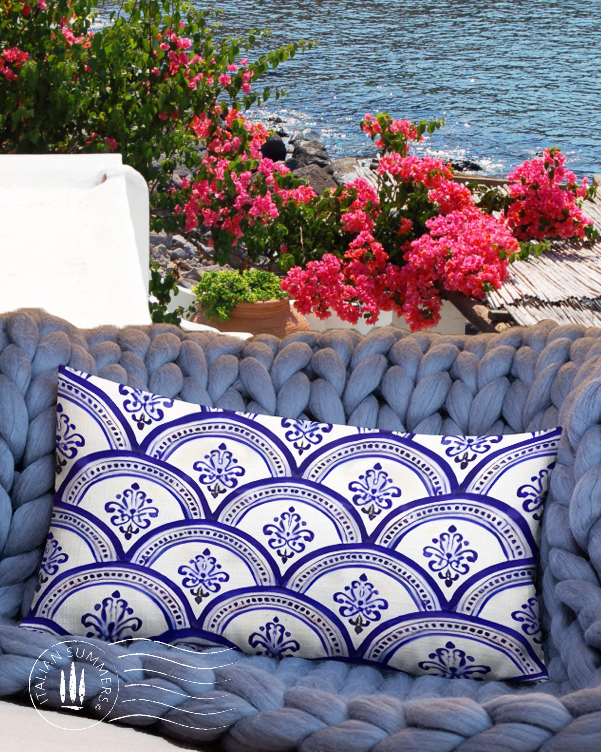 Elegant Amalfi Coast inspired pillow cases that feature an azure Mediterranean 'scallop' pattern, reminiscent of the maiolica-tiled domes of the seaside villages of Campania, Italy.