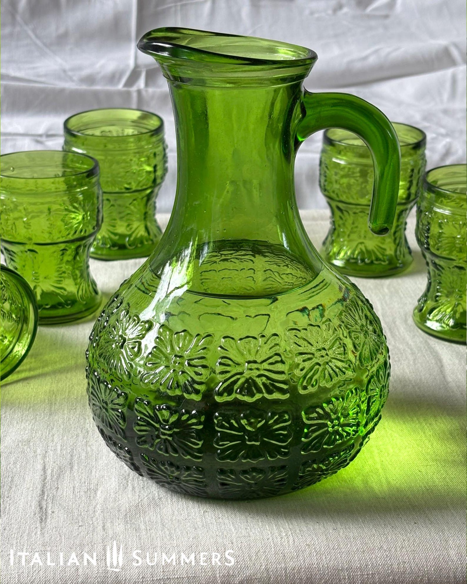 This gorgeous Bormioli of Parma green glass carafe and 6 tumbler set is an iconic piece of Italian 1960s and 70s tableware. Embossed flower patterns on both carafe and tumblers. Made of high resistance Bormioli tempered glass, they are marked 'made in Italy' and have practically no visible scratches, we had a hard time even finding one.