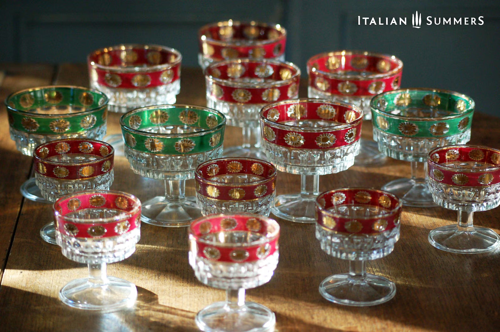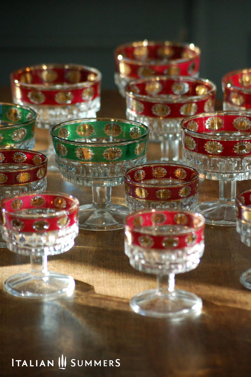 Vintage Italian Christmas gold rimmed glass coupes by Stampi Francolini