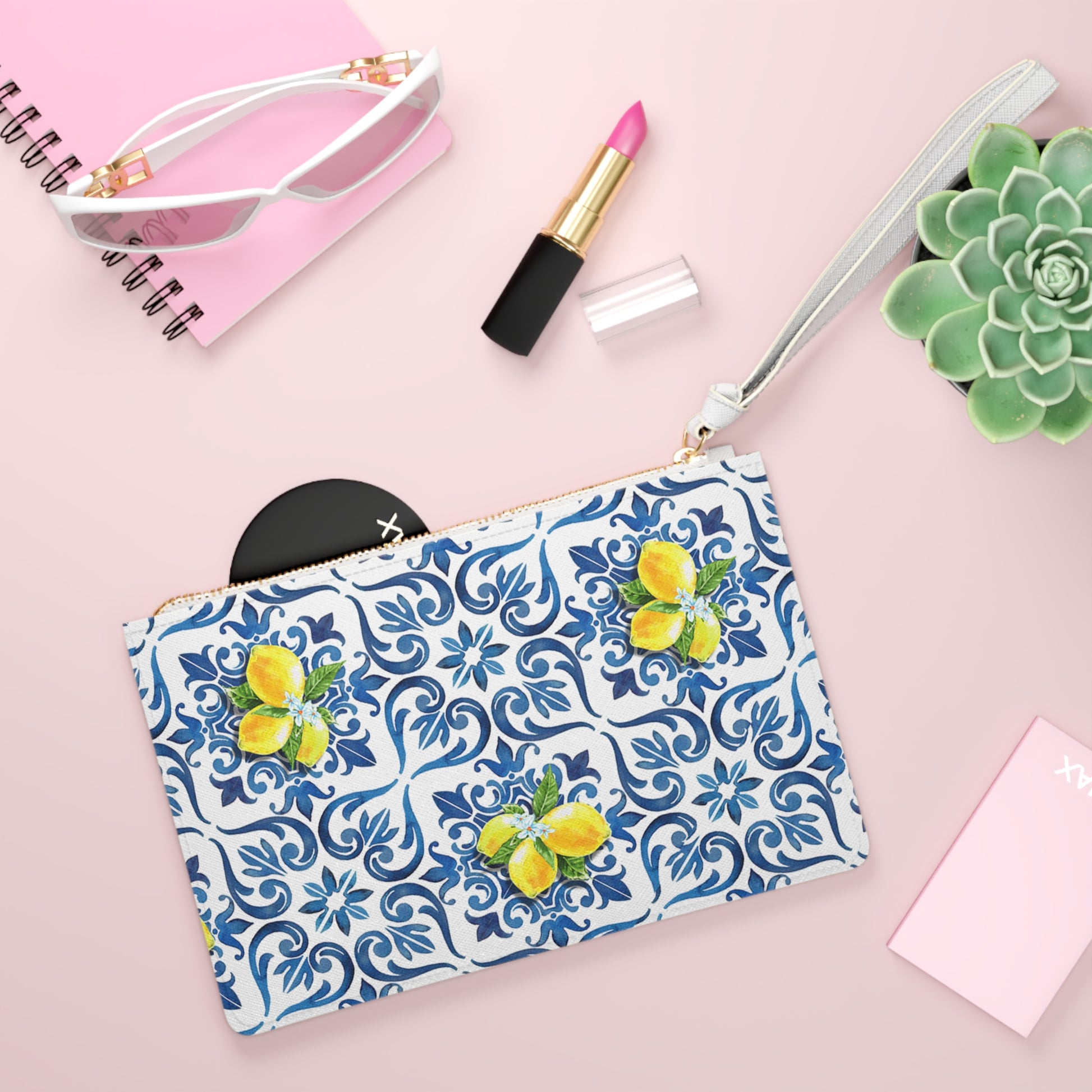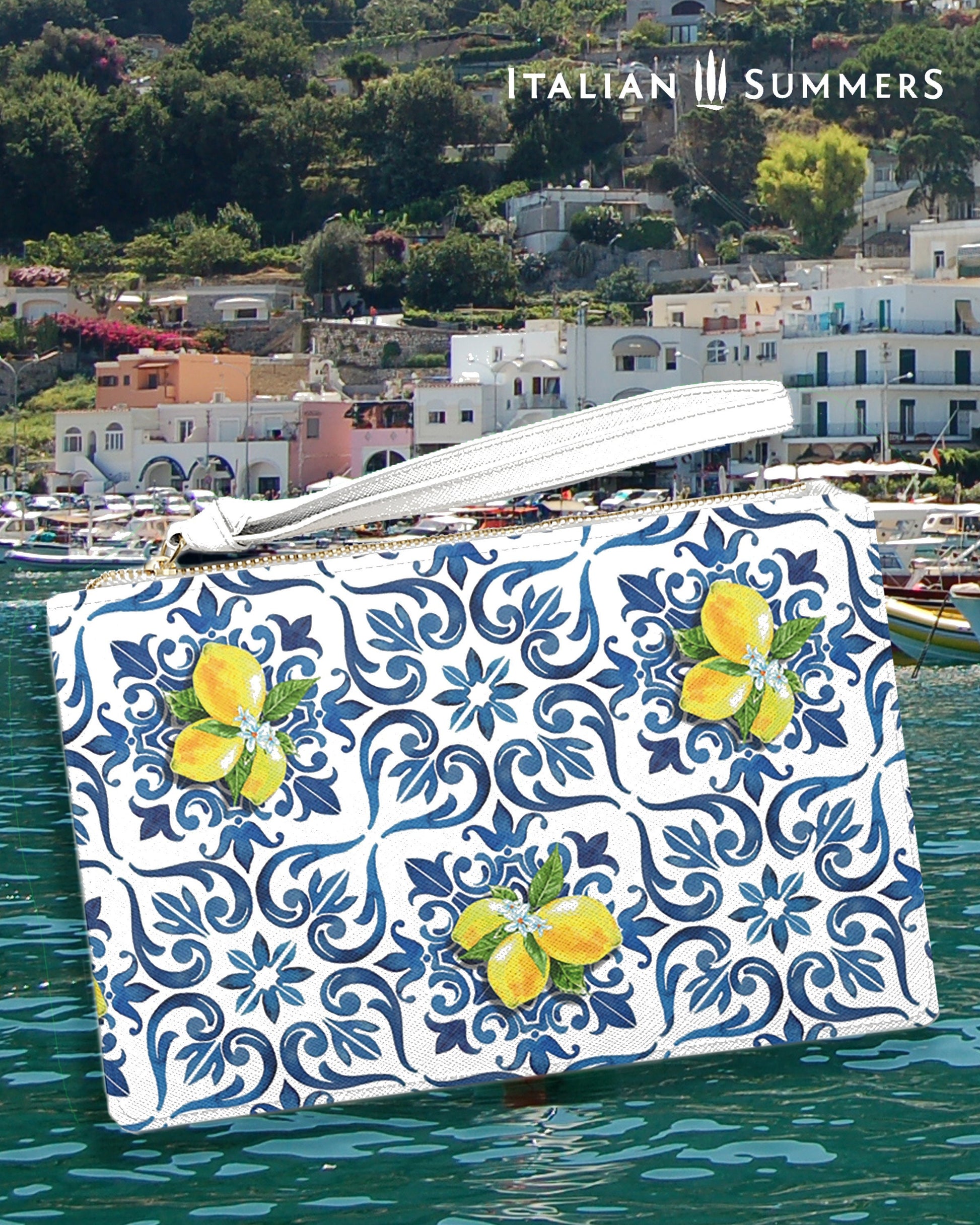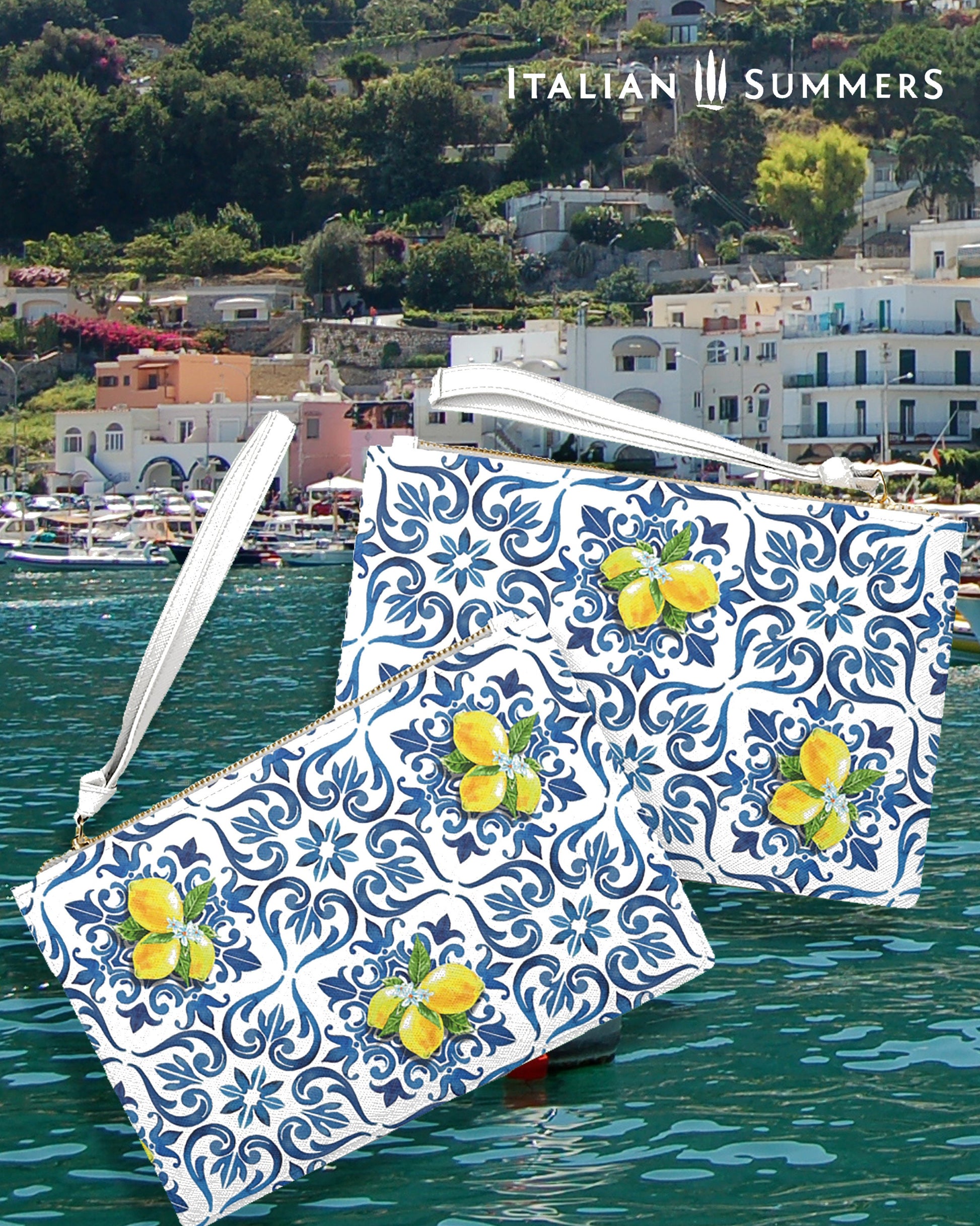 Give your outfit an Amalfi Coast or Sicilian touch with this cute Italian blue tiles and lemons clutch designed with Amore by us! A few things of which we love most,..tiles and lemons are always a good idea. Like Italy is! Just in case you are going to have an Italian Riviera holiday, have a look also at our beach towel with this design.